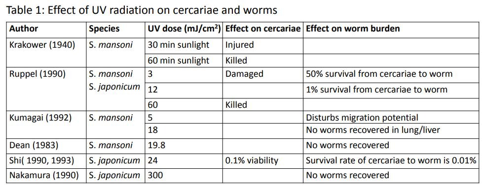 - Ultraviolet disinfection: UV doses as low as 3 mJ/cm2 have been shown to damage cercariae. This damage can affect later life stages; schistosoma have reduced migration potential, and schistosomes can become sterile. UV doses above 60 mJ/cm2 have been shown to kill cercariae. Solar disinfection may be effective in killing cercariae. Many studies lack exact UV measurements.